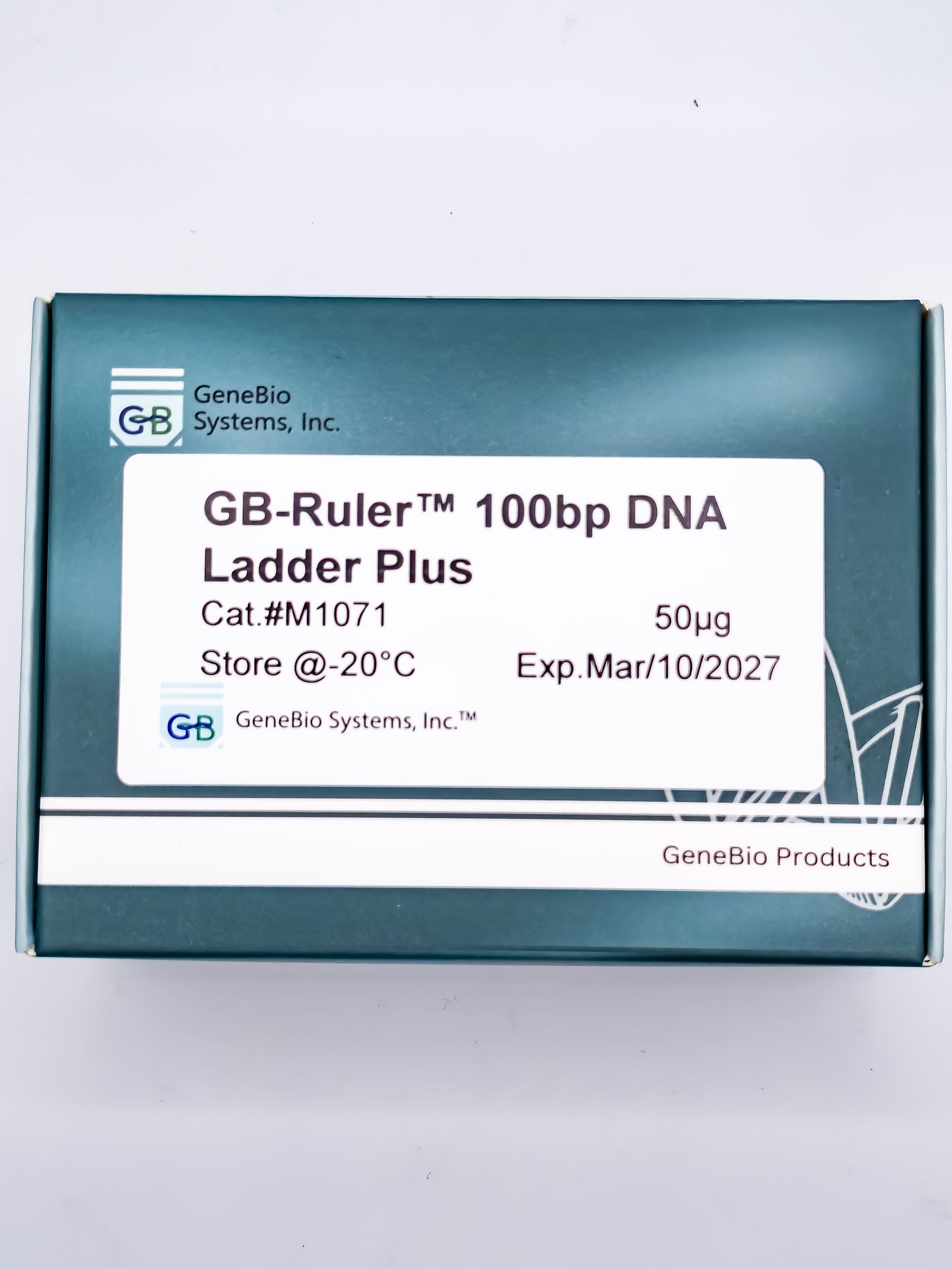 GB-Ruler™ 100 bp Plus DNA Ladder is ideal for determining the size of double-stranded DNA from 100 to 3,000 base pairs. The ladder consists of 14 linear double-stranded fragments. The 500bp and 1,200bp fragments are present at increased intensity to allow easy identification. All fragments are precisely quantified and mixed during the production. For 5 ul loading, all fragments except 500bp and 1,200bp are 40ng. The 500bp and 1,200bp fragments are 100ng. This ladder is pre-mixed with loading dye and is ready to use.