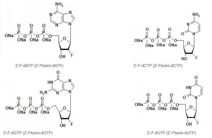 A set of four 2'-F-dNTPs, with 100mM each of 2'-F-dATP, 2'-F-dCTP, 2'-F-dGTP, 2'-F-dUTP. RNAse, DNAse-free, high purity. >2 year Stability at -20 C. Can be used in RNA synthesis reactions to produce RNA with increased stability.