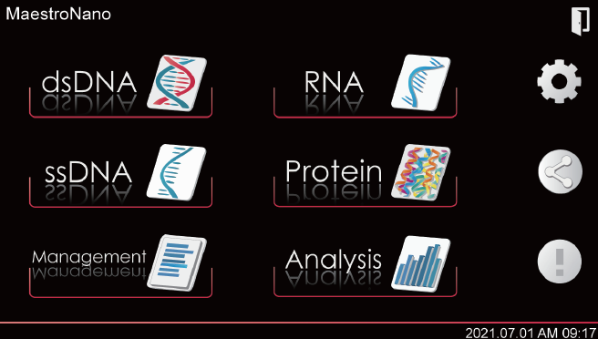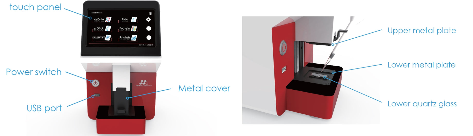MaestroNano is a spectrophotometer for bio-chemical research only. The main function is micro volume concentration quantification, for nucleic acid including double-stranded nucleic acid (dsDNA), single-stranded nucleic acid (ssDNA), and ribonucleic acid (RNA), or protein solution.