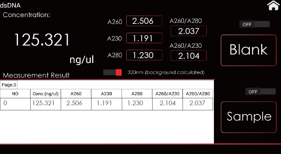 After dispensing sample on the surface of the central area of the quartz glass, users can select sample type and begin to measure.