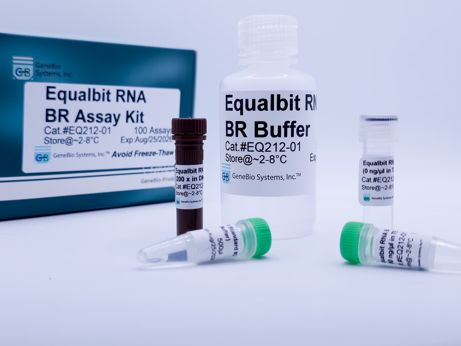 The Equalbit RNA BR (Broad-Range) Assay Kit is a simple, sensitive, and accurate RNA fluorescence quantitative detection kit. This kit contains fluorescence detection reagents, buffers, and dsDNA standards. This kit is highly selective for RNA and is not subject to dsDNA. It has an excellent linearity between 20 ng and 1000 ng for RNA samples, providing accurate quantification of total RNA, rRNA, mRNA samples from 1 ng /μl to 1000 ng /μl. This kit has excellent resistance for most conventional pollutants, including salt, free nucleotides, proteins, solvents, and detergents. The Equalbit RNA BR (Broad-Range) Assay Kit is easy to operate, and the assay can be performed at room temperature. Before use, please dilute the fluorescence detection reagent with buffer into a working solution, and then add the RNA sample for detection by a Qubit® fluorometer.